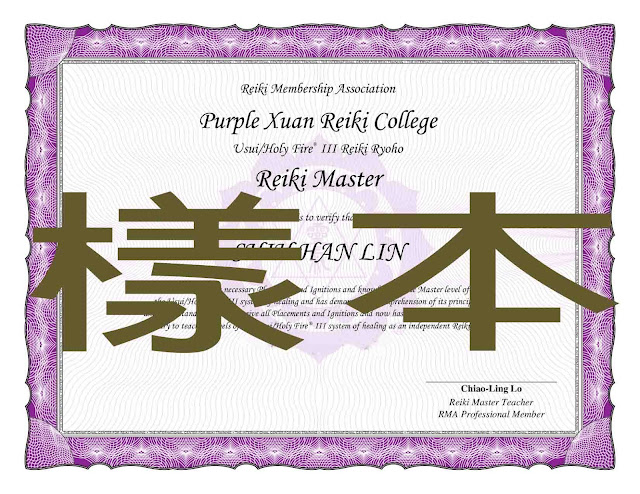亞洲國際靈氣發展協會聖火靈氣大師/導師證書、ICRT® 國際靈氣中心證書、IARP®國際靈氣專業協會導師證書。